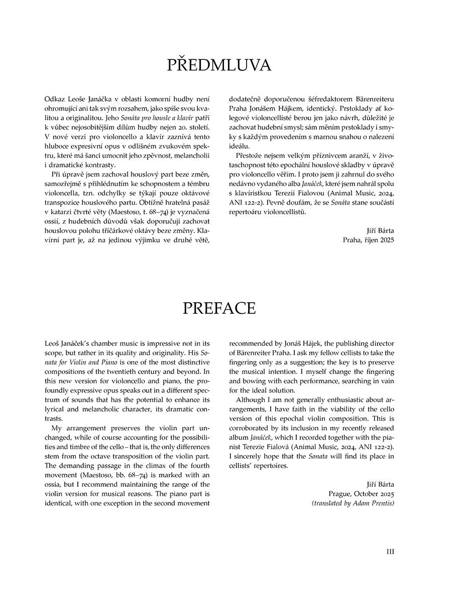 Pohádka pro violoncello a klavír je Janáčkovou jedinou dokončenou skladbou pro violoncello. Jeho Sonáta pro housle a klavír v předkládané úpravě pro violoncello tak přináší violoncellistům další Janáčkovu skladbu, která významně obohatí koncertní repertoár pro tento nástroj. Autor úpravy, přední český violoncellista Jiří Bárta natočil violoncellovou verzi Houslové sonáty s klavíristkou Terezií Fialovou ve světové premiéře pro label Animal Music (2024).